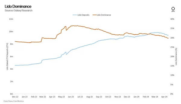 假设以太坊上的质押需求像过去两年一样呈线性增长,那么预计到 2024 年底,质押率将超过 30%。本报告前面提到过,更高的质押率会减少通过增发以太坊获得的回报。以太坊上的流动质押服务(如 Lido 的 stETH)使用户可以轻松质押,并绕过入场队列等质押限制。用户只需购买 stETH 就可以获得质押回报。