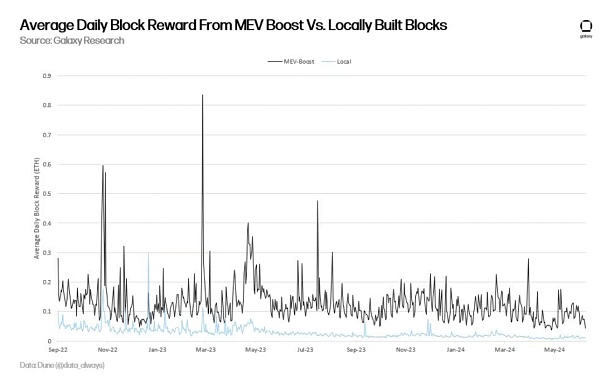 根据 Galaxy 的计算,MEV 可将验证者收益率提高约 1.2%。与其他类型的验证者收入(包括增发以太坊和优先费用)相比,来自 MEV 的验证者奖励占比约为 20%。一些人将 MEV 归因于给予区块提议者的额外价值,该价值不是来自优先费用或增发以太坊。然而,另一些人认为,如果优先费用是用户在提交交易时附加的额外费用,以确保他们的交易能更快地被矿工处理。,那么它本身可以代表 MEV 利润。为了解释优先费用本身可能包含 MEV 的事实,其他方法将使用 MEV-Boost 软件构建的区块与未使用 MEV-Boost 软件构建的区块进行了价值比较。