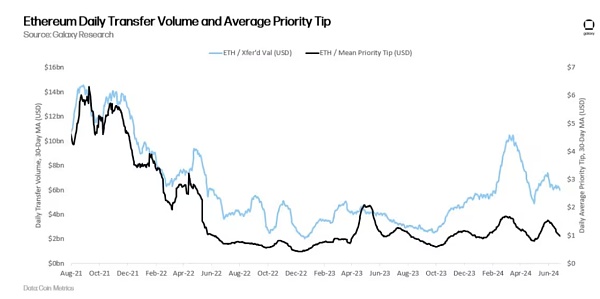 过去两年,由于交易活动减少,验证者的基本费用、优先费用和 MEV 收入也随之减少。通常情况下,链上转移的资产价值越高,用户就越愿意支付 Gas 费用,以便在下一个区块中优先处理他们的交易,同时,Searchers 通过重新排序区块内的交易来获利的 MEV 也会更高。如下图所示,以太坊每日转移的美元价值与交易优先费用之间存在关联: