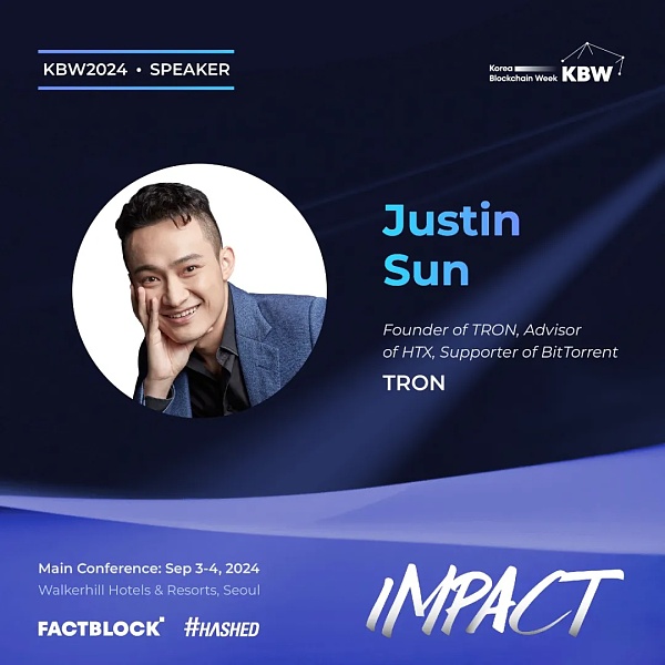 波场TRON创始人孙宇晨将作为演讲者参加韩国区块链周(KBW2024)。