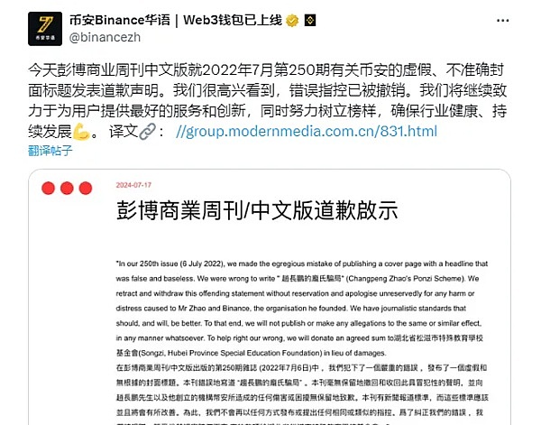 承认“赵长鹏的庞氏骗局”是虚假指控,从发布到道歉用了近两年,伤害容易,弥补却难。希望大家能破除对加密货币的偏见,正视区块链行业及其技术发展。