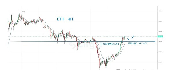 ETH15号的阳线突破压力位确立了后市看涨的形态,但连续接近10天的上涨也意味着市场需要进行一定程度的调整,用来消化小时线出现的顶背离。日线上涨过后的首次回调先当机会看待,第一支撑3394~3363,第二支撑3304~3261。