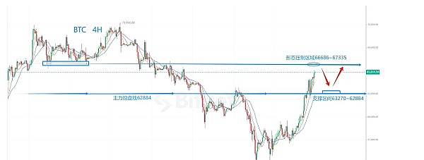 BTC从周线收回MA30的表现上来看,后续市场大的格局还是涨,但要注意内部周期的问题,日线已经连涨6天,早上也看了很多山寨币,基本上都到了中线压力位附近。根据经验判断,接下来2~3天出现局部高点的概率很大,所以这个时间段主要做回调后的低多,切勿追高。进出点位参考:形态压制区域66686~67335,中短线撑区间63270~62884。