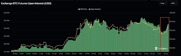 ConsenSys 研究员 David Alexander II 在昨日指出,「经过残酷的一周后,BTC 期货持仓量目前已增加 5.7 亿美元,较上周上涨 21%,并已恢复至 6 月 23 日以来的最高水平」。