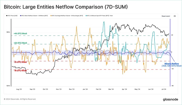 Glassnode 将过去一年中所监测到的「矿工净流量」与「中心化交易所的净存款 / 提款量」以及「流入 ETF 链上钱包的净流量」进行了比较。结果显示,矿工地址的余额变动情况约为每周 ±500 BTC,而 CEX 与 ETF 相关地址经常会出现 ±4K BTC 的较大波动,基于此,Glassnode 认为流经后两者实体的市场影响力可能比矿工的市场影响力大 4 到 8 倍。