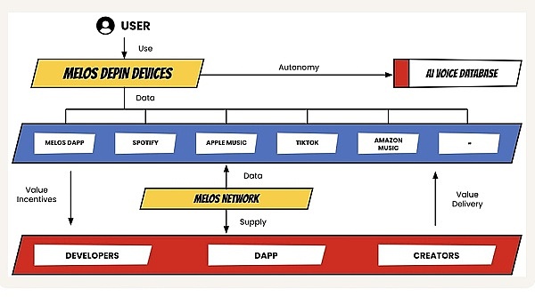 目前,Melos 与 DePIN Institute 展开合作,构建了一个以数据生命网络体系,该体系不仅是一个 Web3 用户数据层,同时也是一个分布式的计算资源聚合层,通过对不同资源的调配以推动前沿科技领域的发展。 在该体系中 DePIN 智能音箱设备 MelosBoom 是 C 端用户进入生态做出贡献的入口,同样这也将是 C 端用户捕获 DePIN 赛道红利财富的重要机会。