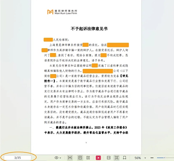 经过这次当面沟通,曼昆律师团队根据检察院关注的重点,调整变化框架,着手起草书面材料。经过团队内部多轮修改和调整,最终形成了长达35页的不予起诉法律意见书在内的多份书面材料。这些书面材料不仅详细阐述了涉案平台的合法性、合规性以及其在数字藏品行业中的正面作用,而且深入分析了案件的法律依据和事实依据,为检察院提供了全面而详实的参考。