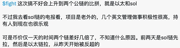 @neso表示,目前Solana链上meme相较于以太坊上同名meme,市值在短短一天内落后数倍虽反常,但也是机会。他选择继续加仓Solana链上的 FIGHT,“只要FIGHT能成为下一个真金meta,无论在以太坊还是Solana上,价值都不会低。”