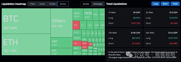 据Coinglass数据显示,过去24 小时,加密货币全网爆仓金额超1.44 亿美元,有超5 万人遭清算(多头占1.07 亿美元)。
