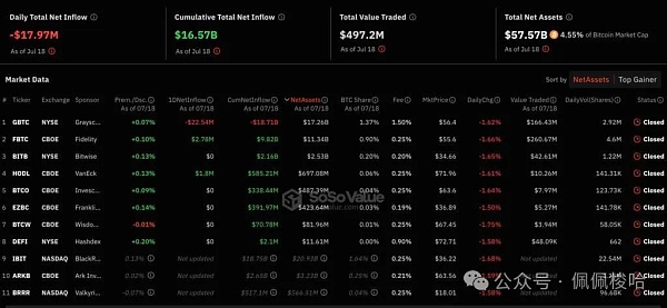 根据Sosovalue数据,比特币现货ETF 已经连续9 天呈现资金净流入;但是7/18 日(还有三家ETF 资料未纪录)由于GBTC 大量流出约2,200 万美元,目前看来大概率将呈现净流出的状况,无法完成连续十天净流入的纪录…。