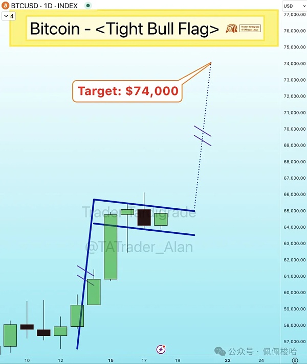 知名分析师Trader Tardigrade表示,根据流行的技术图表显示,价格可能正朝着74000美元的大关迈进,或创下当前的历史新高。该交易员写道:“比特币的下一个目标是74000美元,比特币在日线图上形成了一道紧密的牛市旗形,旗杆的测量目标是74000美元。”