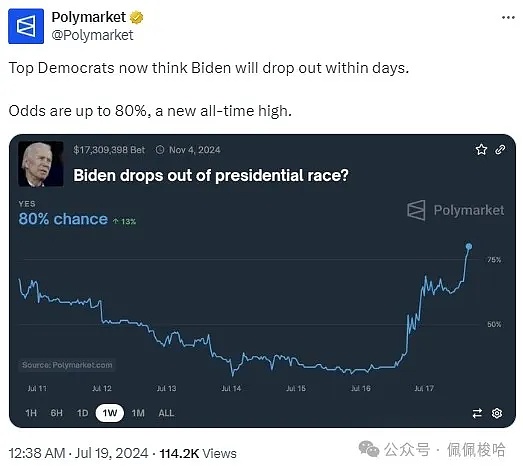 与此同时,Polymarket在推特发文称,民主党高层现在认为拜登将在几天内退选。拜登退选概率已升至80%,创历史新高。