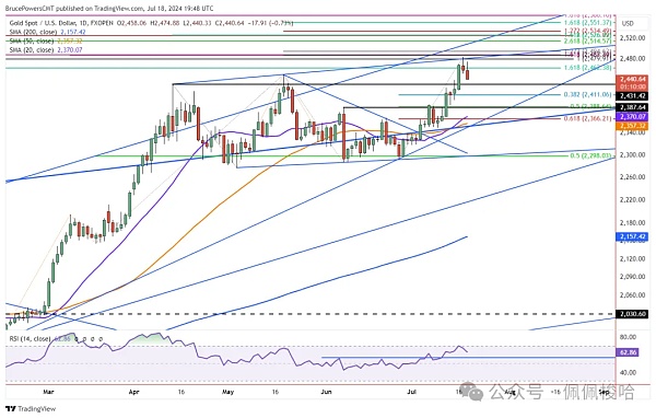 有几个初始价格水平值得关注,以判断可能的支撑位。第一个是4月12日波动高点2431美元。稍低一点的是38.2%斐波那契回撤位2411美元,其次是50%回撤位2389美元。2389美元价格水平的权重略高,因为它也与6月7日的先前中期波动高点相匹配。回调以测试该价格区域作为支撑位可能会为看涨延续提供良好的基础。它高于20日和50日均线,分别为2370和2357美元。此外,它高于所有趋势线。