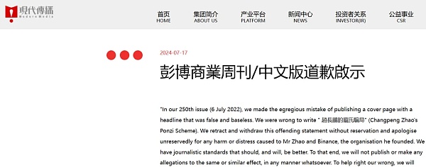 7月17日,彭博商业周刊中文版发布道歉声明,“本刊出版的第250期杂志 (2022年7月6日)中犯下了一个严重的错误 ,发布了一个虚假和无根据的封面标题。本刊错误地写道 “赵长鹏的庞氏骗局” ,本刊毫无保留地撒回和收回此具冒犯性的声明,并向赵长鹏先生以及币安致歉。”