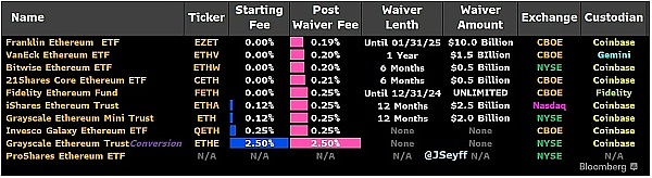 Grayscale 以太坊现货ETF :代号ETHE、费用为2.50%;