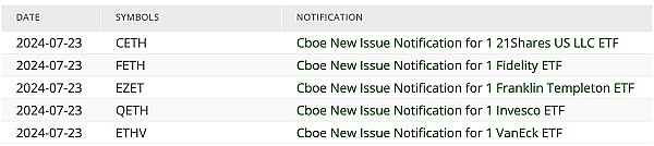 太坊现货ETF 正式推出的预期在经过多次落空之后,目前看来下周23 日的上市正逐渐成为现实。据芝加哥期权交易所(Cboe)官网资讯显示,该平台已新增VanEck、Invesco、Fidelity、21Shares、Franklin Templeton 等5 档以太坊现货ETF 资讯,预计开放交易的时间就在7 月23 日。