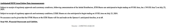 另外,在昨(19)晚灰度的以太坊现货ETF(ETHE)申请文件中,「预计NYSE Arca 上市日期」一栏中也明确指出: