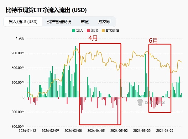 从比特币现货ETF今年的流入看,4月和6月,整体流出较多,7月初已经反转,这段时间行情都是下跌的。但ETF整体,流入绝对大于流出。在德国卖币的情况下,也是较少流出,特别是7月初的跌幅大于4月。
