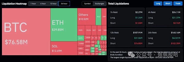 据Coinglass数据显示,过去24 小时,加密货币全网爆仓金额超1.65 亿美元,有近4.3 万人遭清算(空头占1.02 亿美元)。