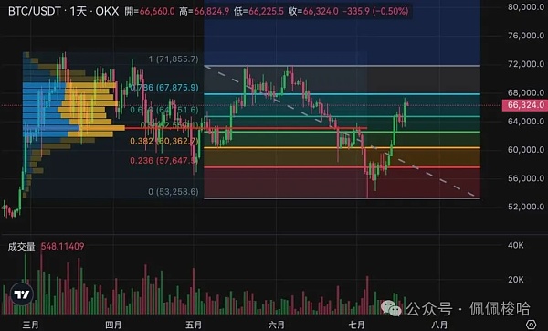 根据斐波那契回撤,比特币一举突破0.618后的下一个压力位(0.786)大约在6.8万美元。同时,这一水平也是成交密集区的上边缘。如果触及该价格后出现明显的下跌,可能会再有一波回调,以积累更多力量。