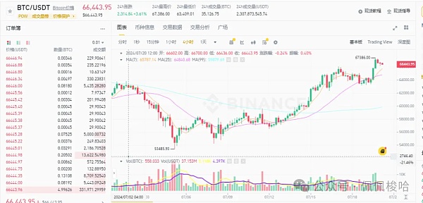 目前有所回调,现报66,443美元,近24小时上涨幅度缩窄至3.61%。