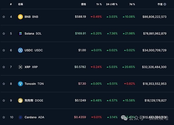 其他前十大代币也同步拉升,涨幅最大的则是SOL,近24 小时上涨7.36 % 一度突破170 美元。BNB、XRP、DOGE 也分别有3~5% 的涨幅。