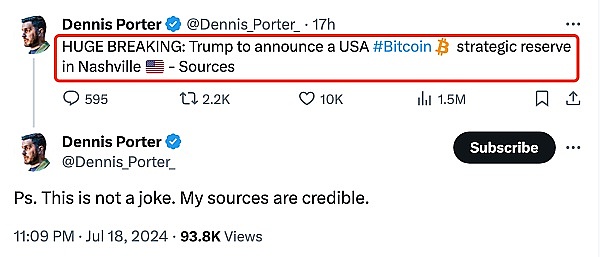 而后,网络上就有人曝出,特朗普或将在出席比特币2024大会时宣布一个令世界震惊的计划 —— 让比特币成为美国的国家级战略储备!