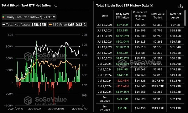 据SoSoValue 数据显示,比特币现货ETF 截至7/18 已经连续10 日净流入,从7 月5 日以来一共流入近20 亿美元。 (目前看来7/19 大概率也会是净流入)
