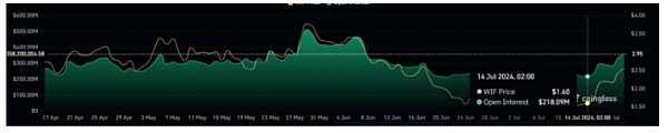 更广泛的市场看涨情绪促使WIF 价格和投资者参与度显著上升。信心和活动的激增导致 WIF 的未平仓合约 (OI) 大幅增加。