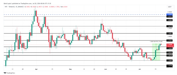 WIF 价格在过去七天内从 1.5 美元上涨至 2.5 美元,涨幅达 65%。目前交易价格为 2.5 美元,接近阻力位 2.7 美元。将这一阻力位转化为支撑位对于 meme 币来说至关重要,因为它可能引导其上涨至 3.0 美元甚至更高。
