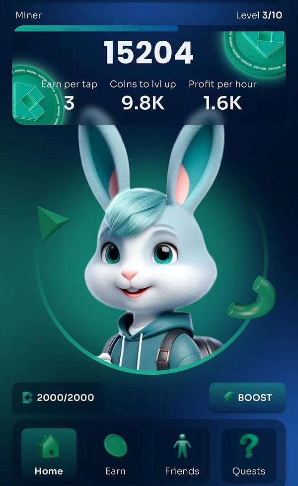 首页(Home):显示你当前的兔子角色、等级、每次点击的收益、升级所需的代币数量,以及每小时的利润。