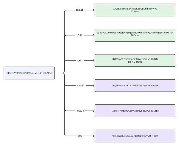 该地址中的比特币目前都已经被转出,比如 7 月 16 日 Kraken 交易所收到的地址就是来自于此,该地址中的资金主要有两大类去向,一大去向是转入支持 Mt.Gox 赔付的交易所中,已知的有 Kraken、BitBank 和 SBI VC Trade,另一大去向便是 Mt.Gox 控制的其他地址中。