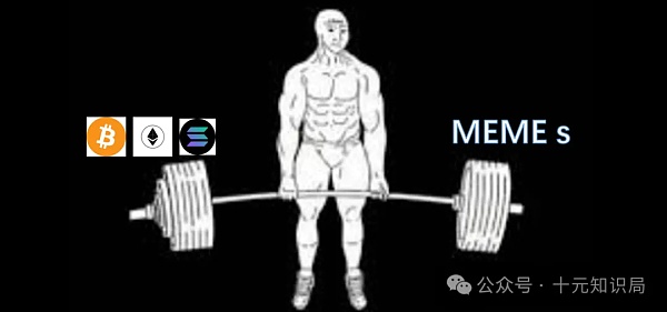 杠铃的一边是持有大饼以太再加SOL等公认的大市值相对稳定的代币,另一边则是持有各类跟着热点走的 Meme 币们。