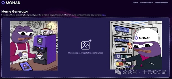 比如下一个备受期待的天王级项目,并行 EVM 叙事加持的 Monad,在自己底层基建和硬核技术的定位下,甚至专门在官网做了一个 "Meme 作图器",方便社区以 Monad 为主题制造 Meme。