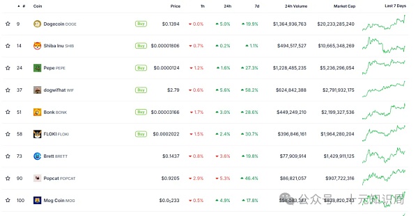 当前加密市值 TOP 100 中,已经有了9个 Meme 币。