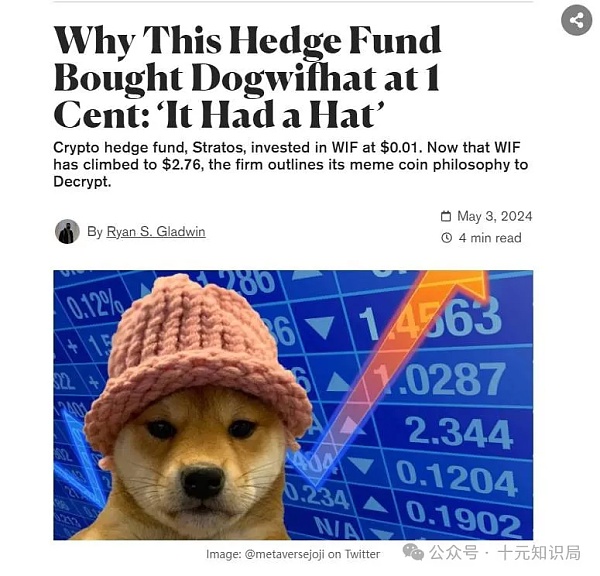 从去年12月开始,由 a16z 提供支持的对冲基金 Stratos 一直运营着一只持有 WIF 的流动基金,当时 WIF 价格为0.01美金,Stratos 一度获得了300倍的利润。