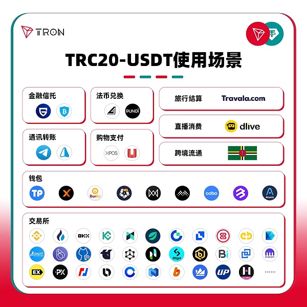 作为区块链技术融入现实生活的典范,TRC20-USDT坐拥超600亿流通量,已获得众多主流交易所和钱包的支持,使用场景涵盖金融信托、购物支付、旅行结算、直播消费等诸多方面。