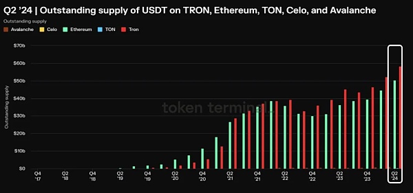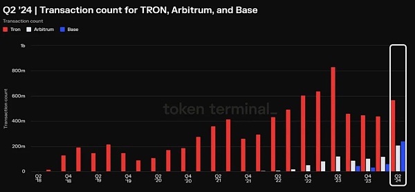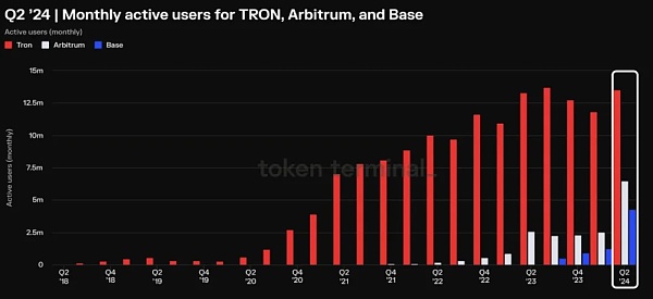 数据显示,波场TRON二季度的平均月活跃用户达1350万,较第一季度有所增长。交易数和费用分别达到5.69亿和4.01亿美元,均超过Arbitrum和Base的总和。其中,波场TRON上近1/3的交易及93%的费用均与TRC20-USDT相关,波场TRON在全球链上支付领域取得了巨大的成功。
