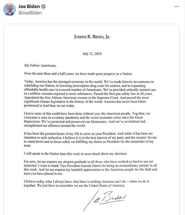 拜登在7月21日的声明中没有说明辞职的原因,只是声称辞职是为了“民主党和国家的最大利益”。他的缺席意味着民主党将在没有他参选的情况下迎接11月5日举行的2024年选举日。