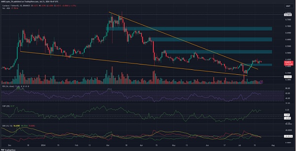 卡尔达诺 [ADA]一直处于下降楔形形态,直到最近出现看涨突破。这一事件预示着该代币将上涨 70%,但看涨者将面临许多障碍。