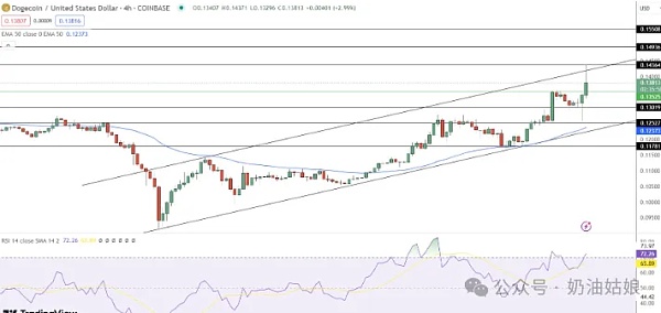 狗狗币的价格为 0.1381 美元,并且表现出强劲的上涨势头。加密货币在定义的上行通道内交易,表明持续的看涨趋势。