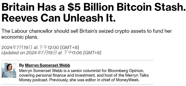 现任彭博财经专栏作家Merryn Somerset Webb撰文,建议英国新任财政大臣里夫斯(Rachel Reeves)应该出售英国没收的比特币,为她的经济计划提供资金。里夫斯继承了二战以来最糟糕的经济情况之一,要实现她「重建英国并让国家的每个地区变得更好」的目标需要很多钱,但有一大笔现金唾手可得,而且不需要课税,那就是英国持有的比特币。
