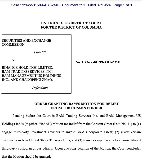 根据美国哥伦比亚特区地方法院下达的命令,币安将能够通过第三方投资经理将“某些”客户资金用于投资,只要币安确保这些资金不会被重新投资到公司或其任何相关实体。