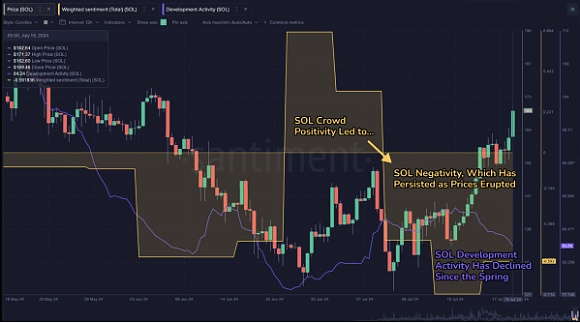 另一方面,Santiment 的分析凸显了围绕 Solana 的持续市场情绪。尽管最近价格上涨,但 SOL 的加权情绪仍然为负,表明市场参与者普遍对 SOL 的潜力持怀疑态度。