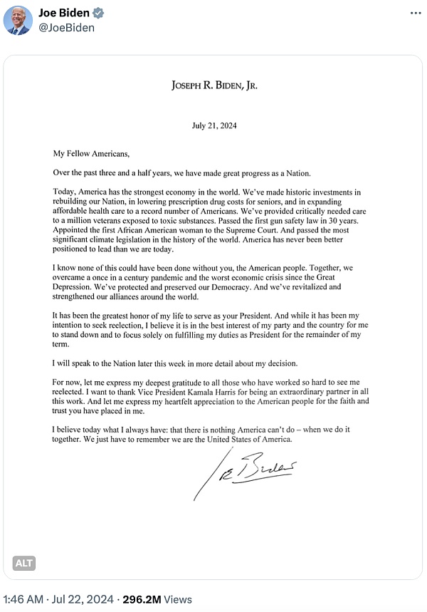 隔夜,据称康复后要重启竞选的美现任总统拜登终于服软,正式签发个人声明,宣布退出大选,英雄迟暮,美人嗟叹(但是并未明确是退出整个选举,还是退出提名,区别是,退出提名,依旧可以被再次提名,退出大选,则就彻底退出了这次大选。)受此消息影响,BTC跳涨至68k上方,令犹豫不决的人内心又平添了几分FOMO情绪。