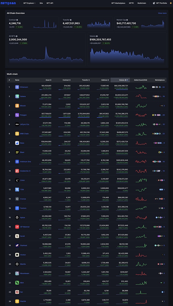 截至 2024 年 7 月 22 日,NFTScan 目前已支持 Bitcoin、Ethereum、BNBChain、Polygon、Solana、Mint、Avalanche、Arbitrum、Optimism、zkSync、Sei、Starknet、Aptos、Mantle、Linea、Base、TON、Blast、Scroll、Viction、Fantom、Moonbeam、PlatON、Cronos 24 条主流区块链网络,共产生: