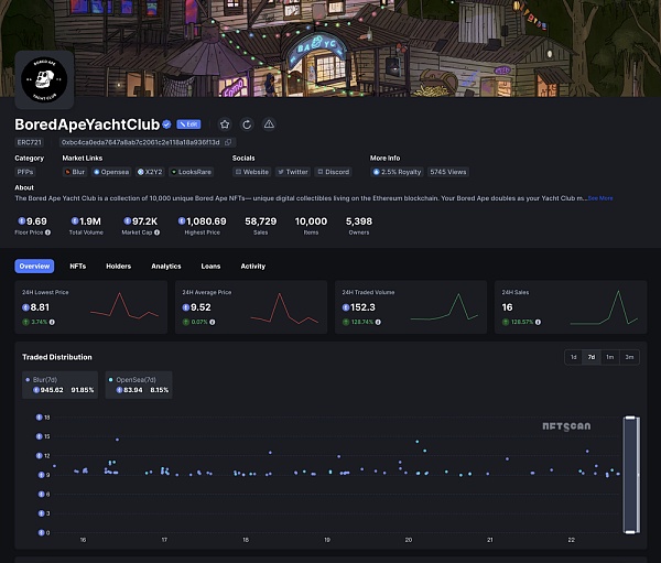 数据显示 BoredApeYachtClub 目前地板价稳定在 9.69 ETH,最高成交价 1080.69 ETH,7d 交易额为 1k ETH 左右,目前以太坊上总交易额已超 1.9M ETH,过去 7 天交易分布主要为 Blur: 945.62(91.85%),Opensea: 83.94(8.15%)单位 ETH,7d 交易笔数达 116 次。