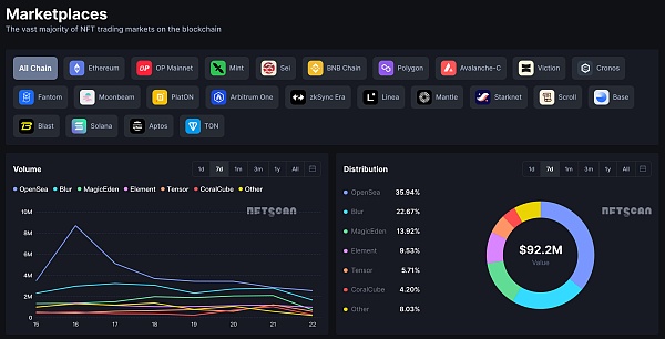 本周:大部分交易市场走势较平稳,Opensea 占市场主导,整体交易额在 7 月 16 日达到最高,0:00 时 Opensea 市场最高达 869.6 万美元,NFTScan 收录 233 个交易市场 7d 总交易额达$92.2m。本周 Opensea 交易额排名第一,市场交易额分布较稳定,排名前六的交易市场及占比分布: