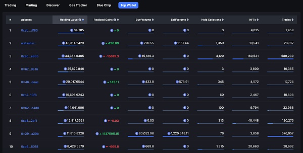 NFTScan 对排名前 1000 的 NFT 持仓价值钱包地址进行了分析,当前持有价值排名前 10 如下图所示:
