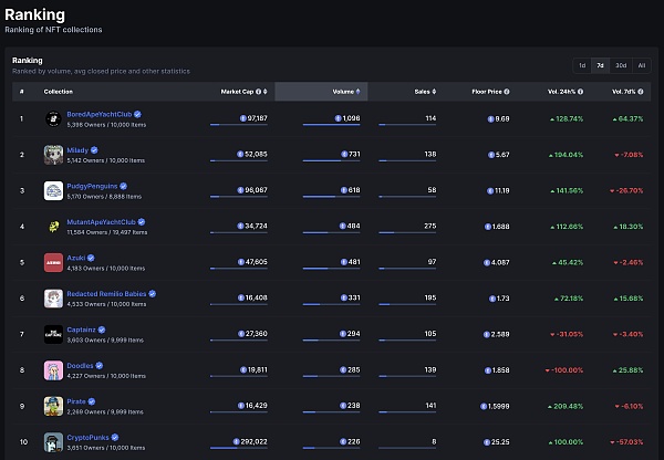 本周 BoredApeYachtClub 位列第一,地板价于上周稳定在 9.69e 左右,7d 交易额达 1,096e;Milady 以 731e 的交易额位列二,目前地板价为 5.67e;Pudgy Penguins 以 618e 的交易额位列第三,目前地板价为 11.19e;大部分蓝筹 NFT 整体市场交易额和地板价有下跌趋势。